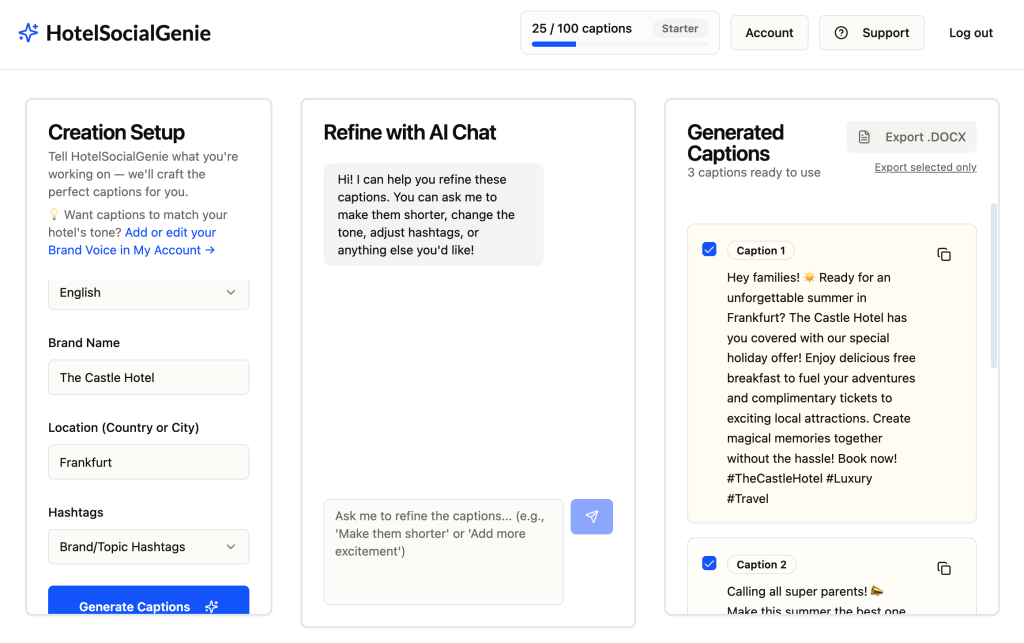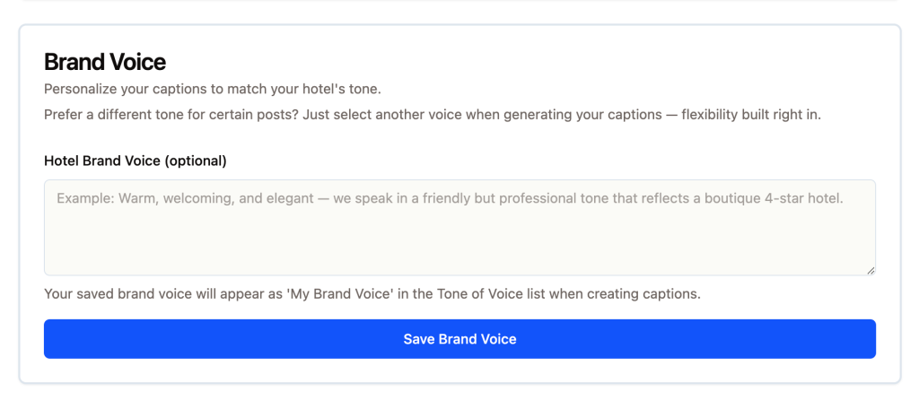 Every caption reflects your hotel’s personality — luxury, casual, family-friendly, vibrant, or your custom brand voice.