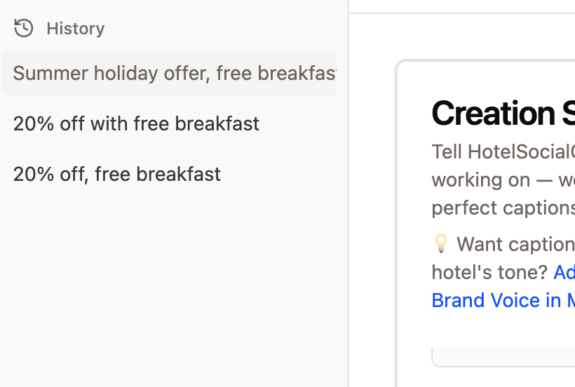 Just describe your promotion or idea — 20% off stays, festive dining, spa packages, things to do nearby — and HotelSocialGenie transforms it into multiple caption variations with relevant hashtags and CTAs.