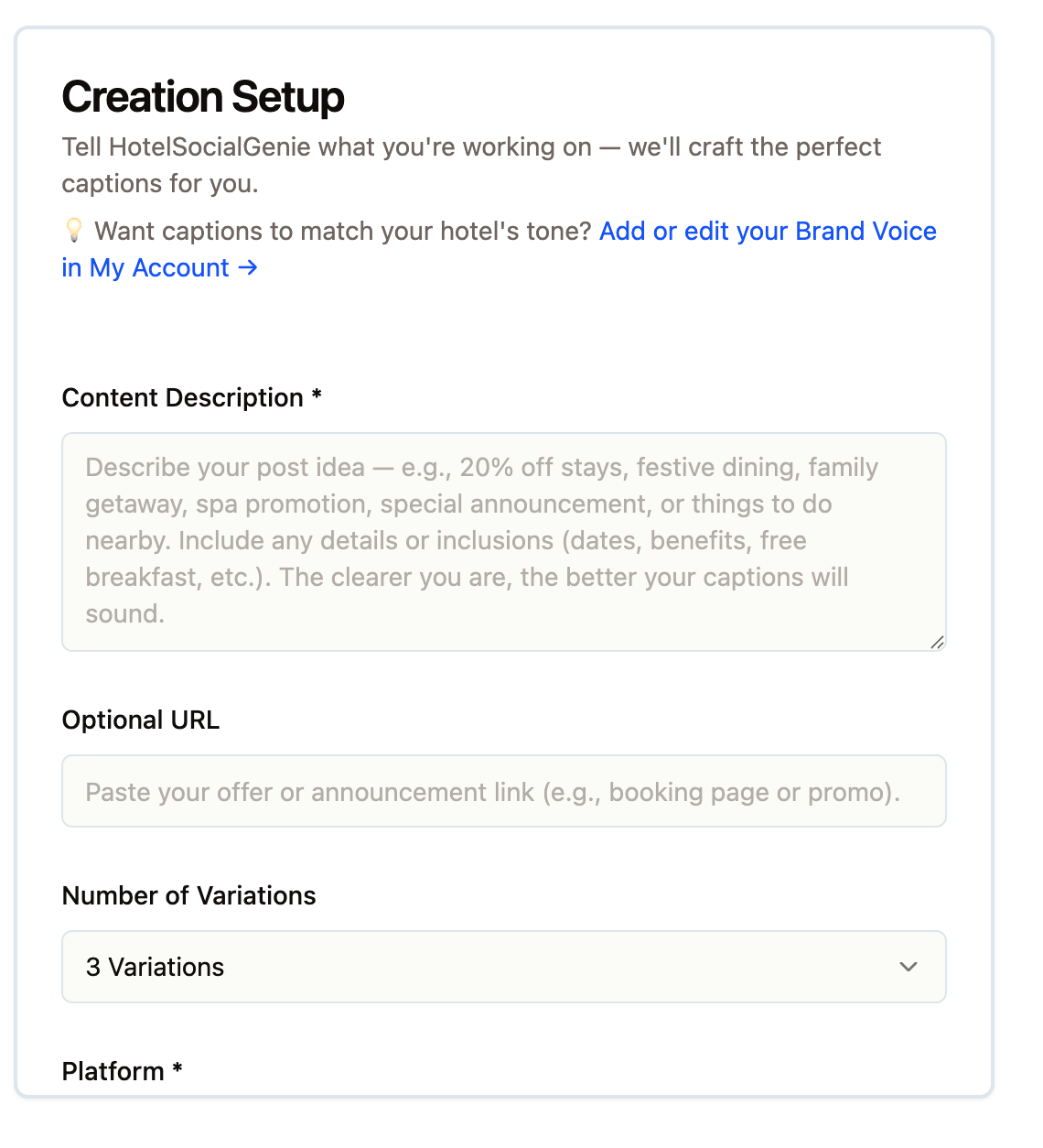 Share your idea or promotion. HotelSocialGenie generates multiple caption options instantly.